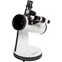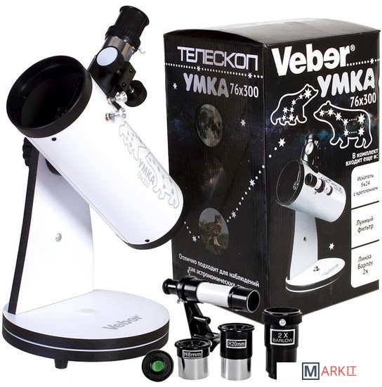 Телескоп Veber Умка 76/300 это классический рефлектор Ньютона на азимутальной монтировке «турельного» типа (Монтировка Добсона). При таких небольших размерах (длина трубы 300 мм, 76 мм диаметр) может показаться, что это детский телескоп, но посмотрите в него- и ваше мнение изменится кардинально. Тем более, что с увеличением 15 крат (окуляр Н20 мм) вы сможете сфокусироваться и днем на любые объекты. Этот телескоп можно использовать и как настольную зрительную трубу.